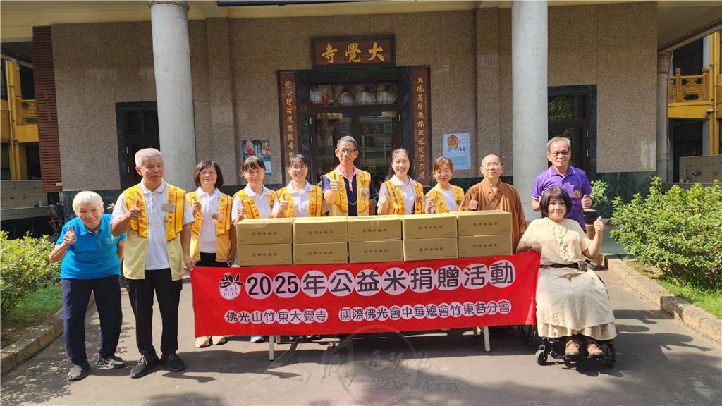 為響應國際佛光會推動的「零飢餓稻米買一送一專案」,佛光山竹東大覺寺於10月15日舉辦公益米捐贈活動,捐出120包公益吉祥米給桃園市脊髓損傷者協會,由理事長聶麗屏代表接受。