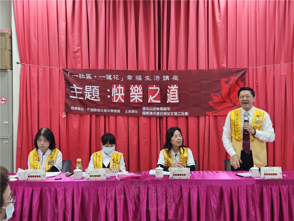為推廣人間佛教理念,落實「一社區一蓮花」精神,國際佛光會中華總會安定第二分會3月10日於西港區港東里活動中心舉辦幸福生活講座,以「快樂之道」為主題,由國際佛光會世界總會檀講師楊政達主持,邀請人間佛教宣講員陳芷芸、顏思騏、吳叔勳擔任與談人,吸引近110位社區民眾踴躍參與。